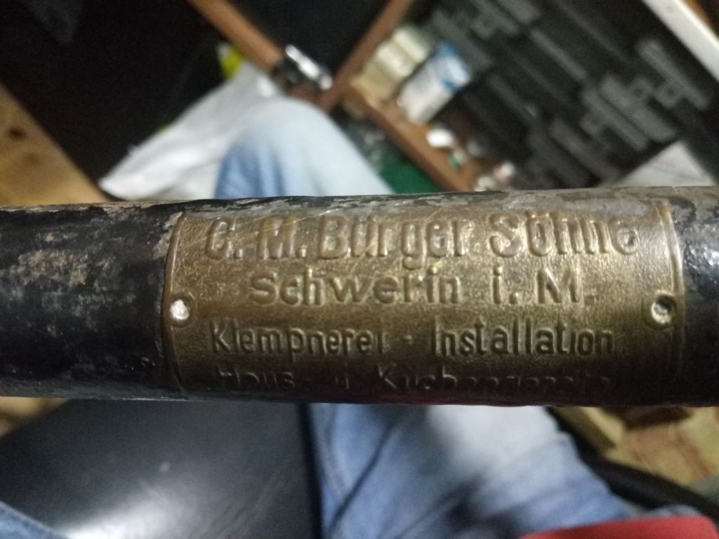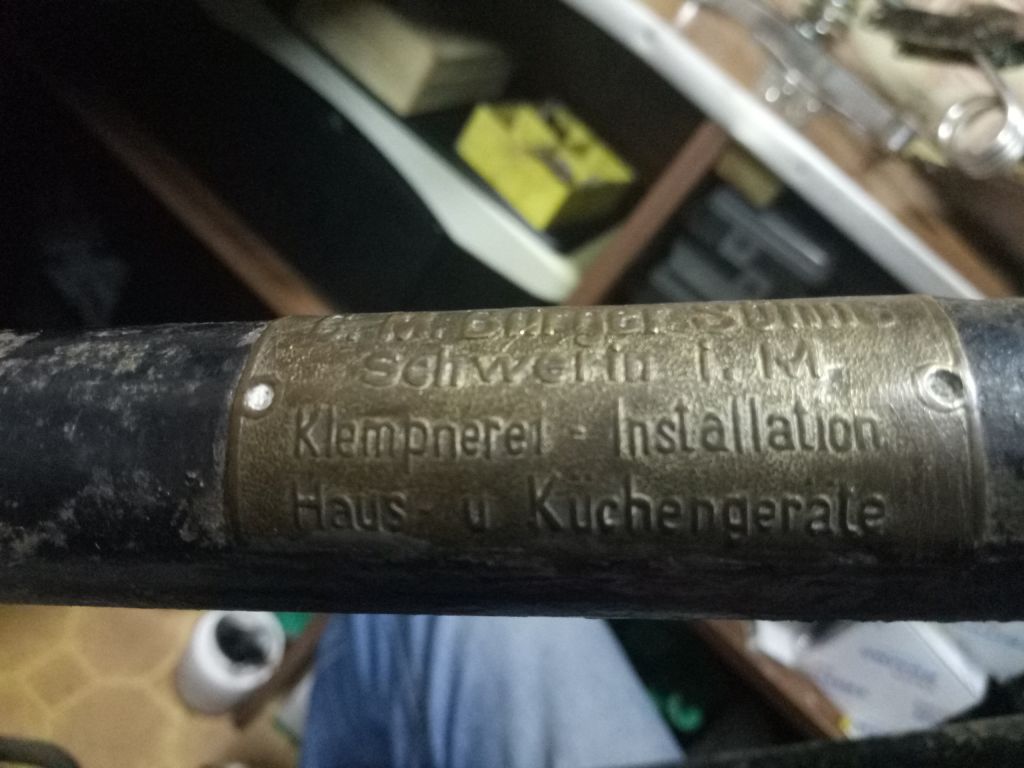Шильдик марки отсутствует, зато имеется припаяная табличка на верхней трубе рамы. В немецком я не силен, но предположительно, что на ней указан город и ФИО, вот только кому они принадлежат?