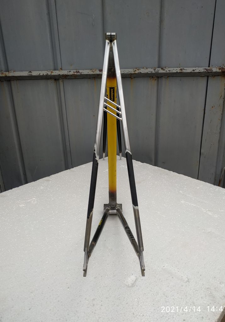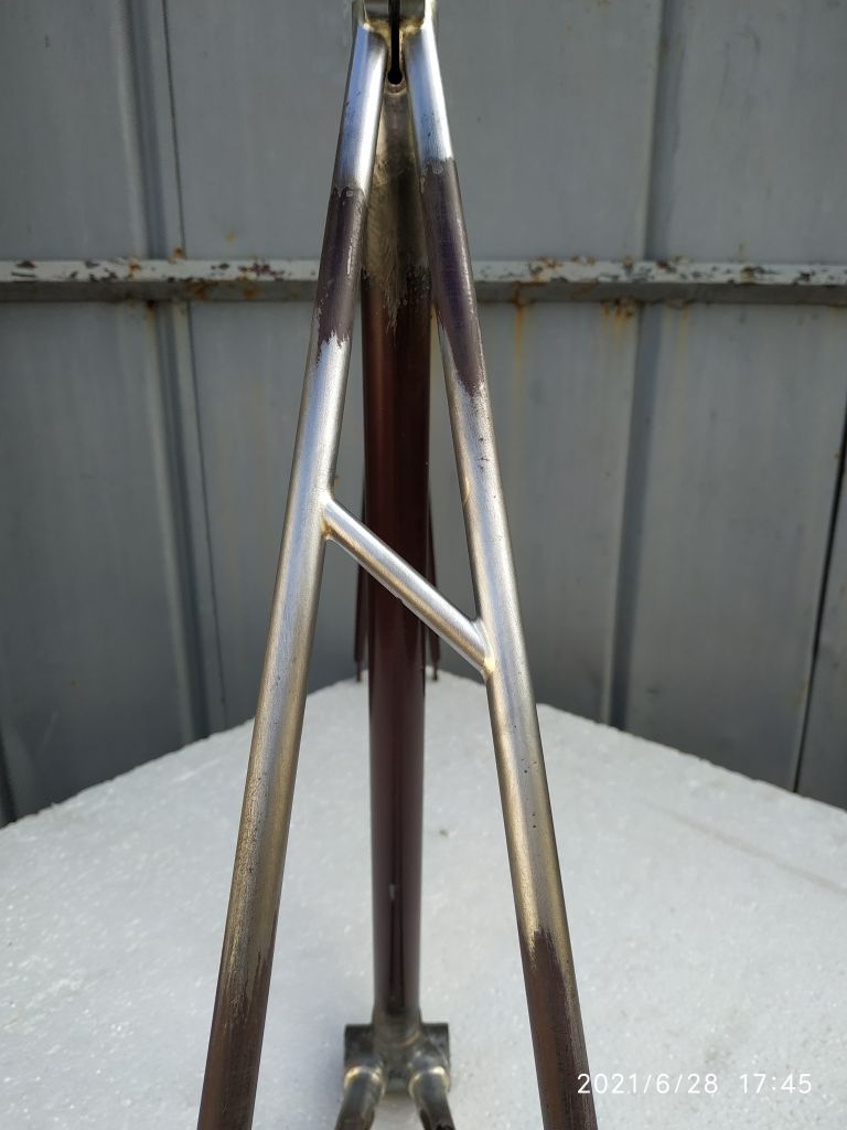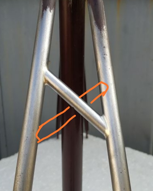Я бы попытался обыграть головной узел рамы: сделать прямой, но скошенный мостик в паре с умышленной стилизацией невозможного здесь прямого перпендикулярного ( оборвать в воздухе)