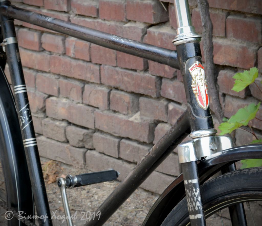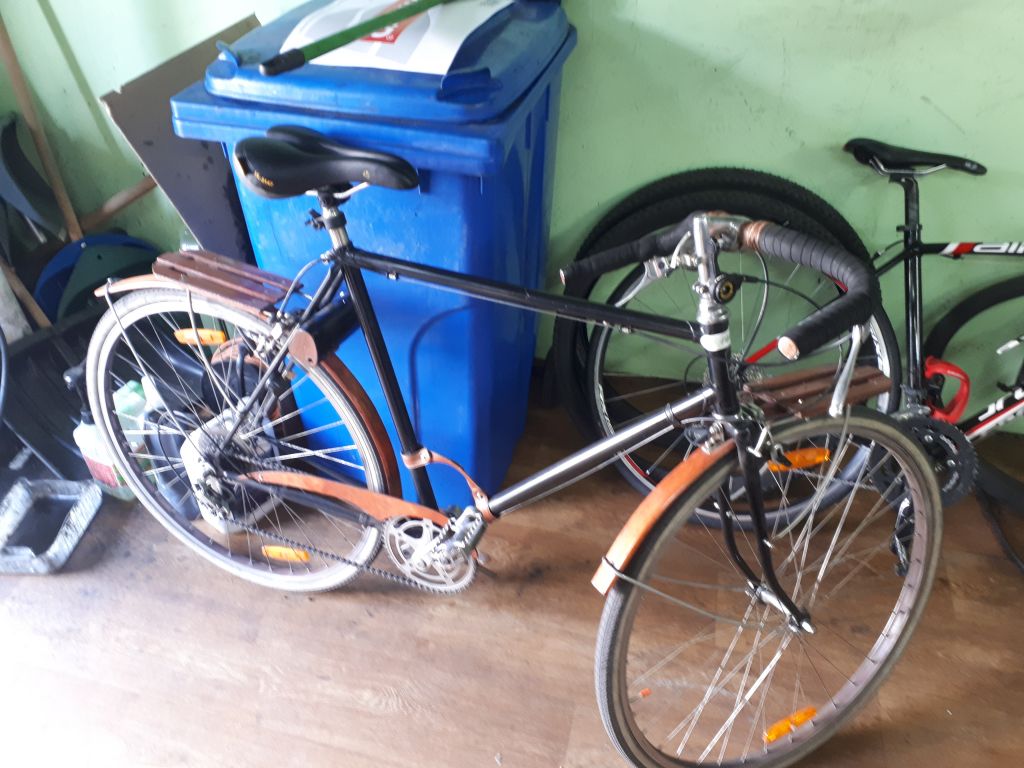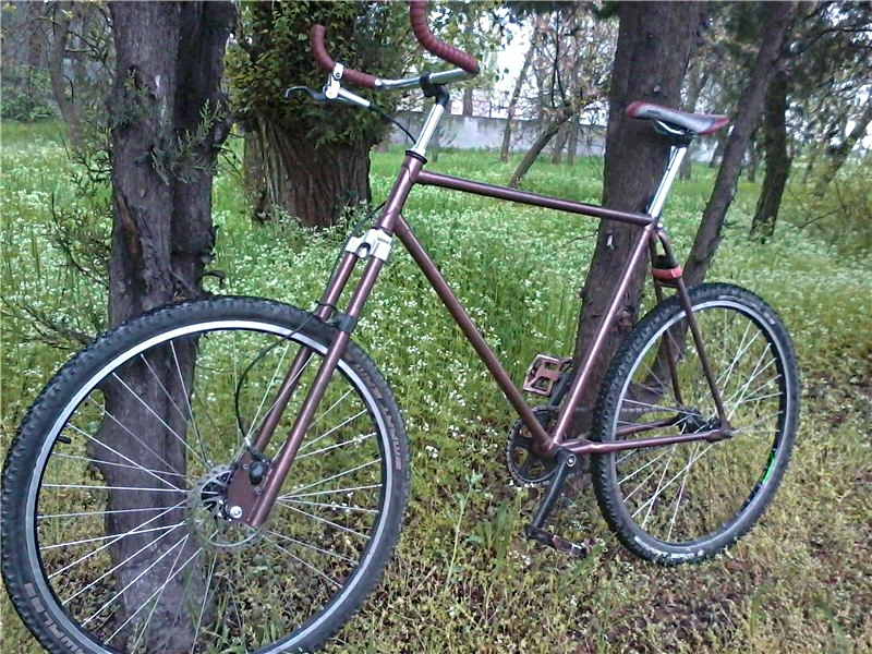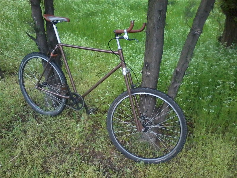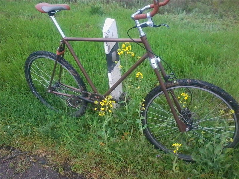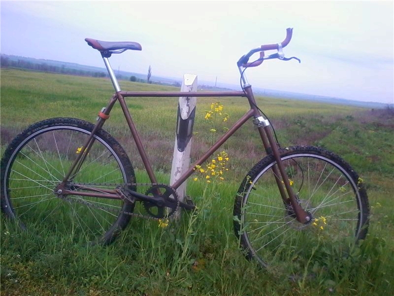 Рама:Украина, В -76, т.е модель 1976-го года, пайка латунью, перемычки задних перьев — верхняя — труба, нижняя — полтрубы разрезанные вдоль. Это отнюдь не тот вареный пластилин, что выпускался позднее под именем "Украины". Досталась с вилкой и родной рулевой, вилку — на полку, рулевую — в дело. Шарики перемеряны, хром чашек — в идеале. Резьбы целые везде, чашки каретки зашли от руки! Кто-то криворукий выкрасил веником краской для стен "советский хаки")), да еще под два слоя грунта — пришлось смыть и зачистить до блеска. За то ему спасибо — рама — как консерва, ржавчины — ни следа! Крашена порошком, цвет — коричневый металлик.
