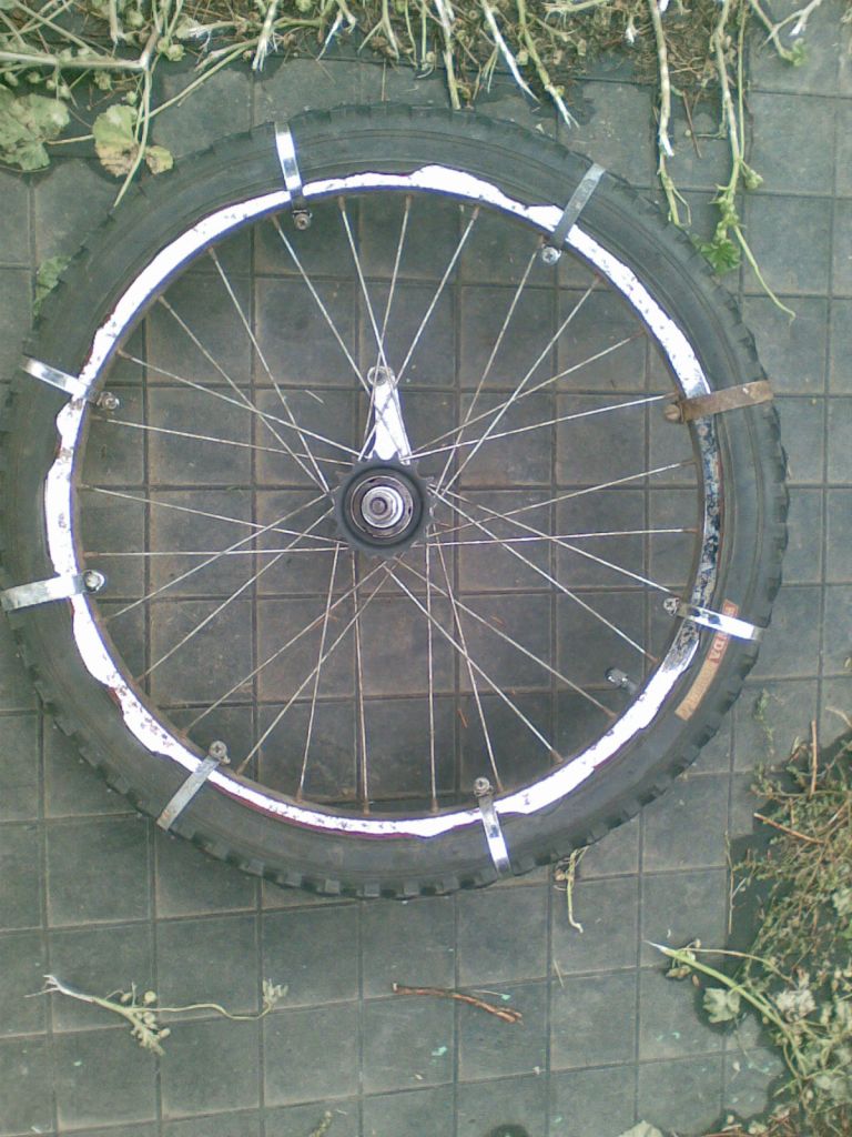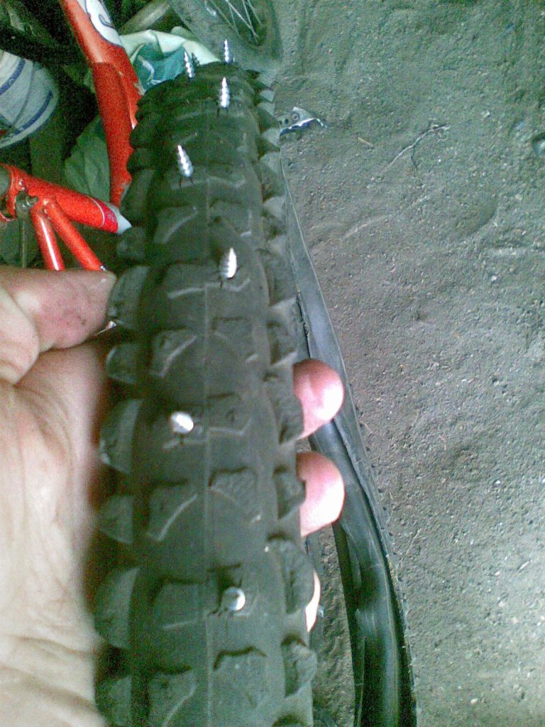 Даже при 2 ряде саморезов, а сзади обычная покрышка , велосипед устойчив. Однако при наличии заднего шипованого , всё меняется в лучшую сторону. Хомуты можно такие или пластину тонкую взять (далее просверлить отверстие под болт. Потом примерять на одетой покрышке и снова втрое отверстие просверлить. После всё скручивается. Хотя на чермете, такие хомуты стоят копейки  img/bv ).