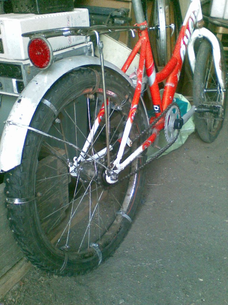 Заднее колесо устойчиво и очень гребущее по снегу. Хотя 2 или 3 , 4 ряда саморезов  сзади желательно. Это колесо 20х2,1 поэтому оно шире и мне понравилось, а переднее вроде 20х2,1 . Кстати 61 саморез установился в заднюю покрышку.