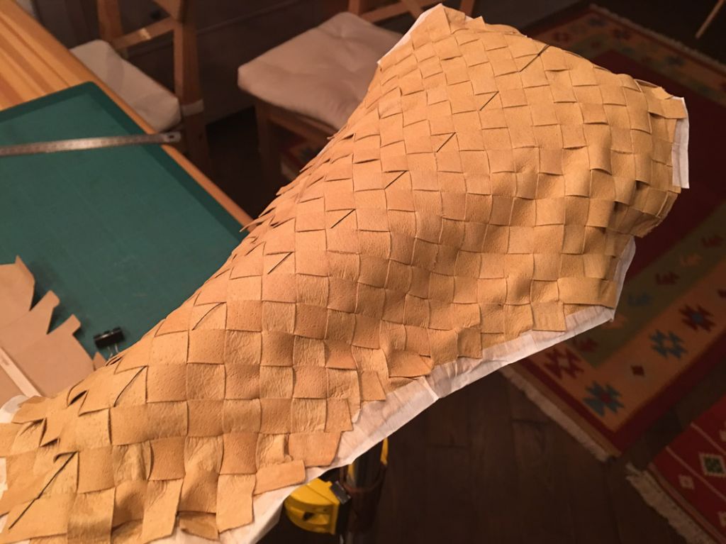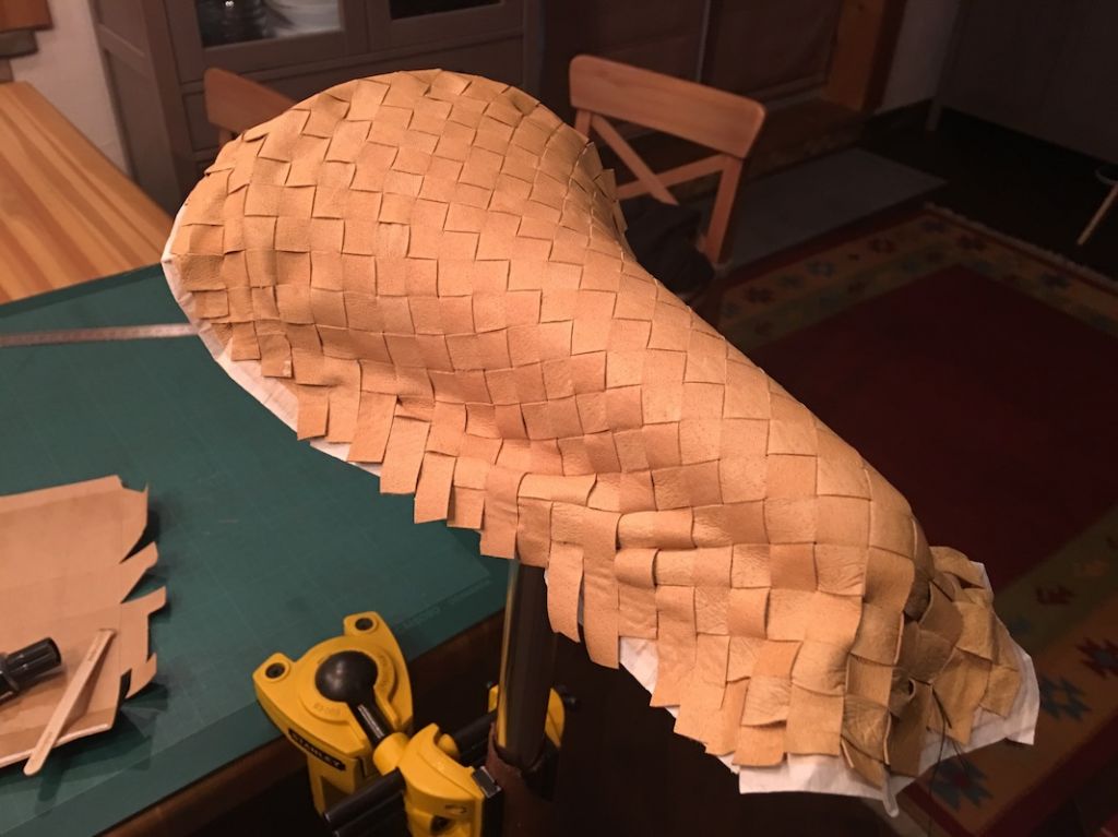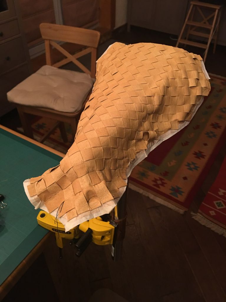 Кожу покупал из остатков, кусок размером примерно 0,7 х 0,7 метра обошелся в 12$ (400 руб.), и для плетения использовалось едва ли половина. Это свиная кожа, одежный велюр, толщиной 1,2 — 1,5 мм., очень эластичный, вытягивается на 1/4 часть по длине или даже больше. Мне, для целей эксперимента, понадобилась изнаночная сторона, лицевая же, собственно велюровая поверхность, выглядит отлично, но нам не подойдет. В дальнейшем предполагалось покрыть поверхность финишным составом на основе воска и масла, чтобы закрыть поры, и защитить от влаги и грязи. Дополнительно, пропитка дала бы более темный, коричневый естественный оттенок, который мне нравится больше.