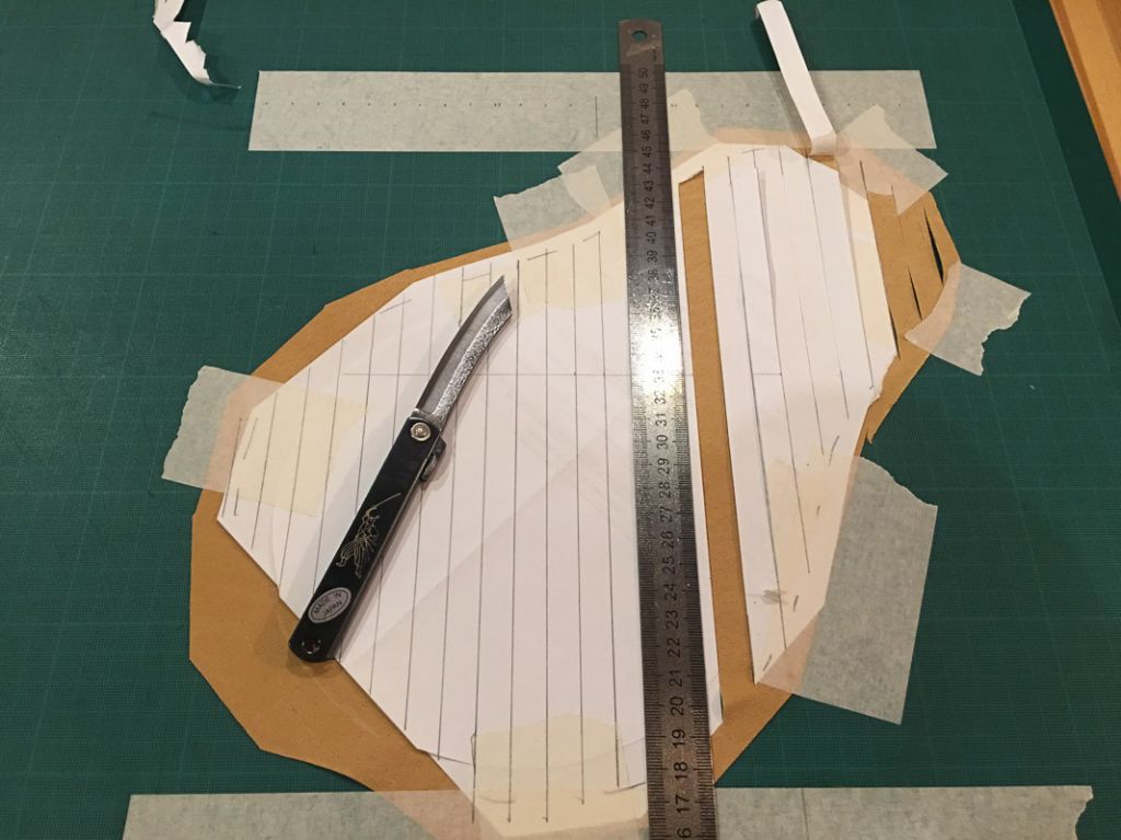 Делаем выкройку и размечаем линии разрезов. Наклон пелетения 45 градусов выбран потому, что в этом случае будет легче подгонять изделие по форме сидения, и самое важное, заводить концы за бортик основы. То есть, сама плетеная конструкция позволяет придавать ей форму за счет эластичности полосок кожи.
