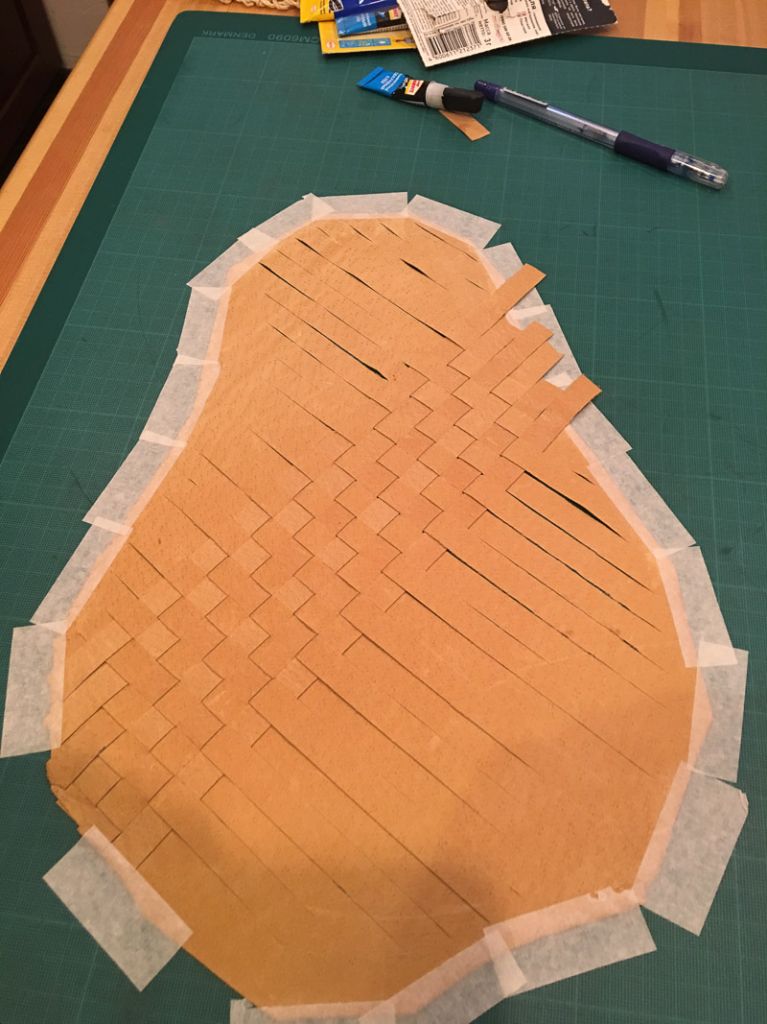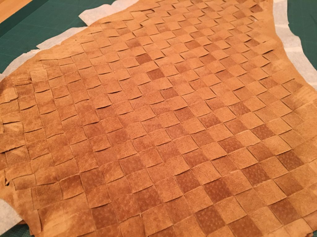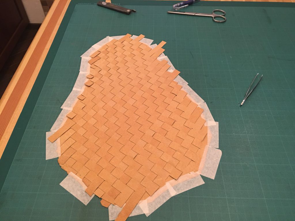 Кусочки скотча подогнул и приклеил с другой стороны, это создало нам некоторую опору при выравнивании-натяжении полосок для создания плотного плетения. Нужно иметь в виду, что скотч оставляет на кожи частички своего клея, что может помешать в некоторых моментах. Дальше, проводим уплотнение плетения путем подтягивания полосок, вытянутые концы полосок разрезаем, чтобы выбрать слабину, и клеим их на край выкройки — края все равно будут обрезаны по окончании процесса.