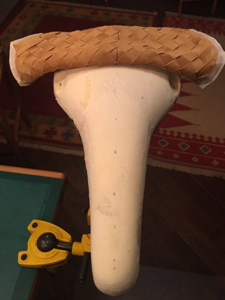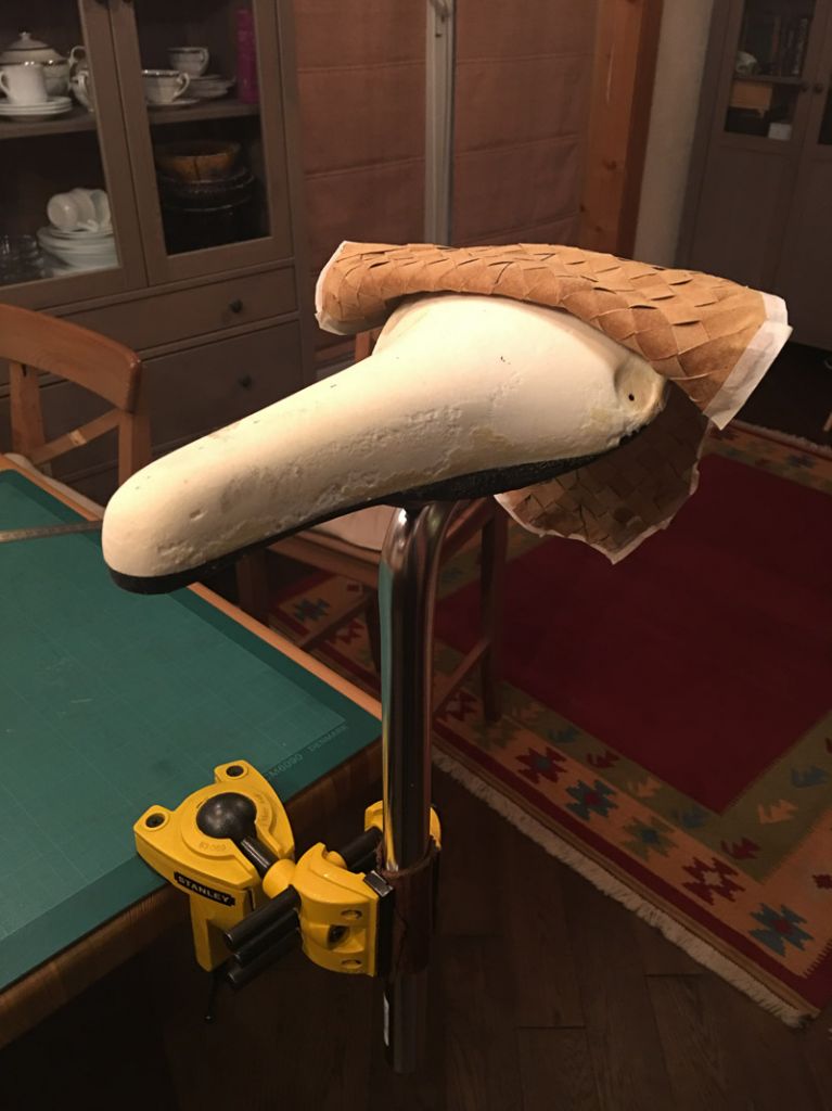 Дальше, закрепляем седло на подседельную трубу, в тиски, находим осевую линию, в плетении аккуратно между полосками ниткой намечаем эту же осевую линию и начинаем клеить. Клеим вдоль по осевой линии полосками по 1,5 см, не больше, следя за плотностью расположения полосок, поправляя их пинцетом, и если нужно, натягиваем их. Клей использовал контактный Момент, прозрачный. Нужно следить, чтобы не было излишков, нанесенный слой клея выравнивал палочкой от мороженого, используя ее как шпатель. Клей быстро высыхает, поэтому медлить с ним нельзя, и по этой же причине клеить лучше небольшими участками.