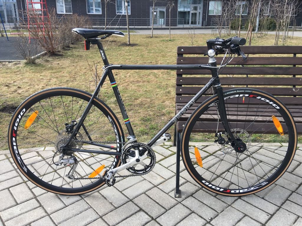 На раме Старт-Шоссе 90-го года выпуска Сергеем был задуман велосипед категории цикло-кросс. Основу проекта составили широкие 33 мм. колеса с дисковыми тормозами, руль с переключением передач индексными манетками, кассета 9 ск. с набором звезд МТБ 11-32, передние звезды 48/38.