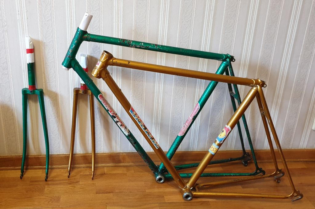 Рама была в нормальном состоянии, геометрия в порядке, а вот лакокрасочное покрытие требовало замены. Потёртости и коцки на покрытии не в счёт. Тот родной цвет, в который рама была покрашена на заводе, можно было назвать «тёмно-жёлтый грязно-золотистый под лаком». Перекрашивать нужно было однозначно!