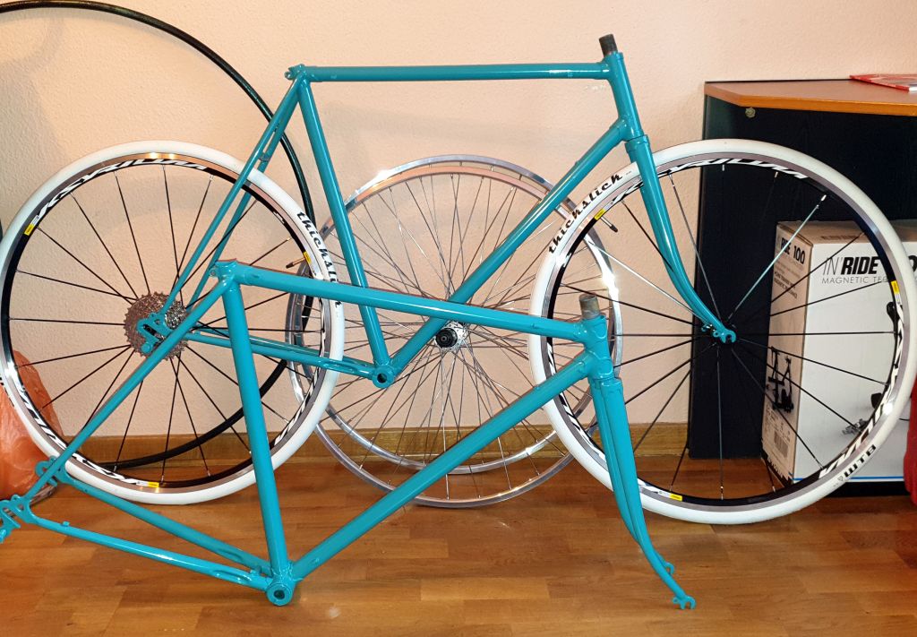 «И тут Остапа понесло». Решили красить и того "Крокодила" К1, что отдавал практически всю свою навеску «Ромашке». Значит, комплектуем «Ромашку» заново, покупаем ей всё новое и красивое. Оба велосипеда уходят в семью младшего сына. Цвет рамы выбирали они сами: хотелось что-то похожее на «celeste», но цели копировать известную марку не было. Чтобы оба велосипеда больше дополняли друг друга, кроме общего цвета рамы, решили поставить и покрышки одного цвета. Перелистав КРОКОГАЛЕРЕЮ +100500 раз – отдельное спасибо Хранителю галереи — выбрали белые покрышки, как у «Автоматика» и «Сестры» от Henk’а.