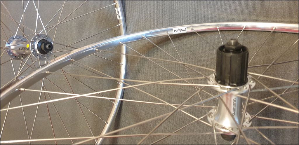 Выбор пал на Octopus Udeep 15 (32 спицы). Соответственно, к таким ободам нужны втулки на 32 спицы серебристые с полой осью. При всём кажущимся богатстве выбора в Москве и на просторах сети, купил стандартные Шимановские Tiagra. Колёса собрал сам, переднее колесо в два креста, заднее в три. Так как въезд в Москву в этот период был ограничен, отдал настраивать колёса в местную мастерскую. И очень пожалел об этом.