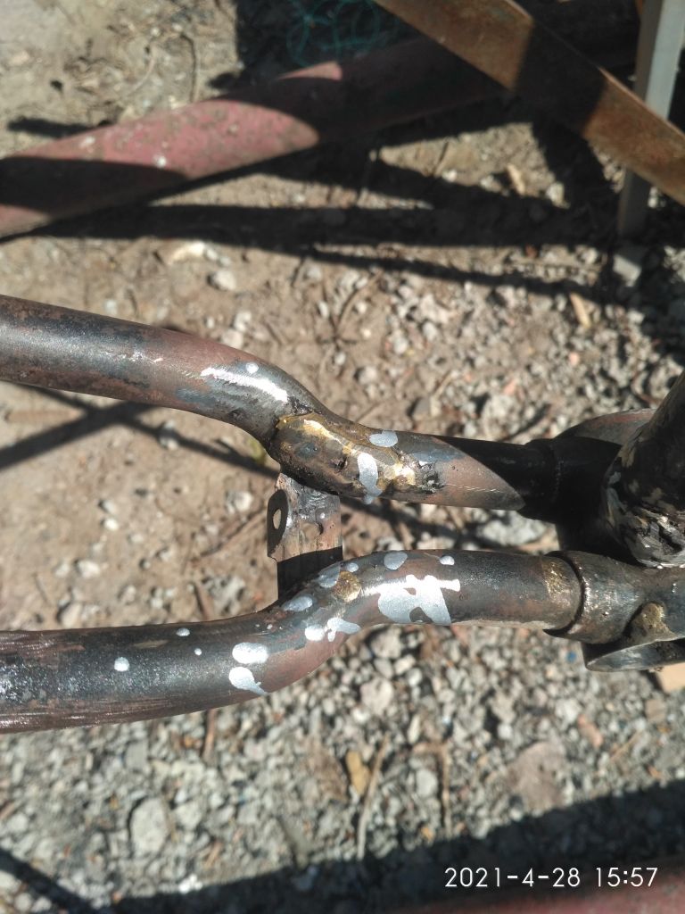 Прораббайк. в активній фазі. безкоштовний велик із металобрухту , який здать жалко, а колегам со стройки по цигарки літать саме воно. на базі мінська '68. сьогодні вчився паять латунню. халтурно вийшло, але нехай. дірка пропалена електродом 15*8 мм вилікувана накладкою. отак і товчуся у себе на стройці у вільний час майже щодня, а похвалитися нічим. в планах path racer на базі ммвз '80, є втулки штурмеєвські з барабанними гальмами , задня трьошка, цей проект повинен бути цікавим, хочу закосить під speed5.
