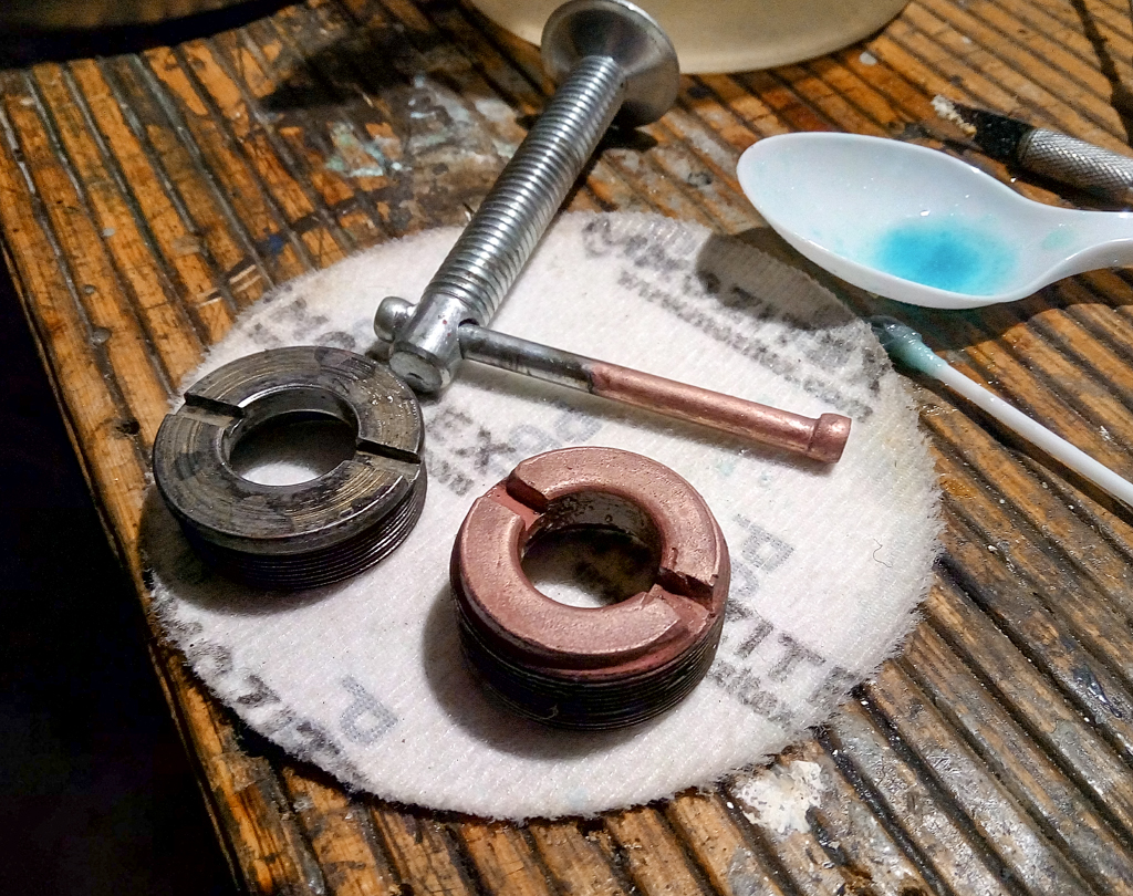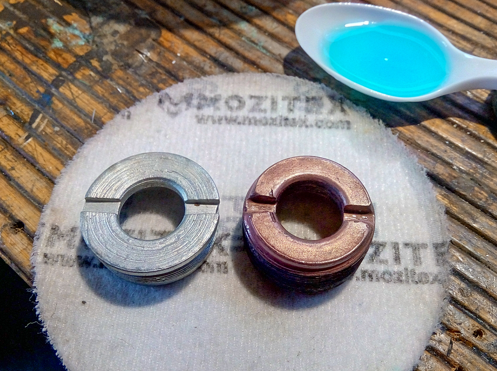 Наигравшись, подвожу итоги. При качественной обезжирке детали, медь хорошо въедается в поверхность. Чтоб медь на детали была красивой, поверхность должна быть отшлифована под зеркало. Медь плохо переживает полирование войлоком с автополиролью — сразу тускнеет, пастой ГОИ не пробовал. Зато проволочным кругом неплохой эффект получается, но это крайность. Также повторные слои нанесения раствора на подсохший слой меди ухудшают поверхность, она тускнеет или даже не так... теряет блеск что-ли. Красивше всего получается медь первыми слоями на отшлифованную поверхность img/ay