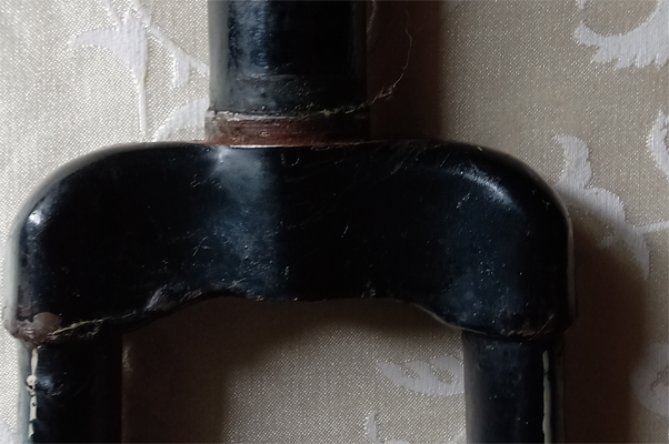 2. Той гальмовий важіль, що дійшов до мене на В-110, був прямий суцільний з гнутими "вусами", але додатково він був зігнутим в площині так, що майже не діставав своїми "вусами" до заднього пера рами. Якщо б такий вигін він отримав внаслідок гальмування, то на пері, напевно, був би слід. А його немає. Пояснити появу такого важеля на цьому вело я не можу.