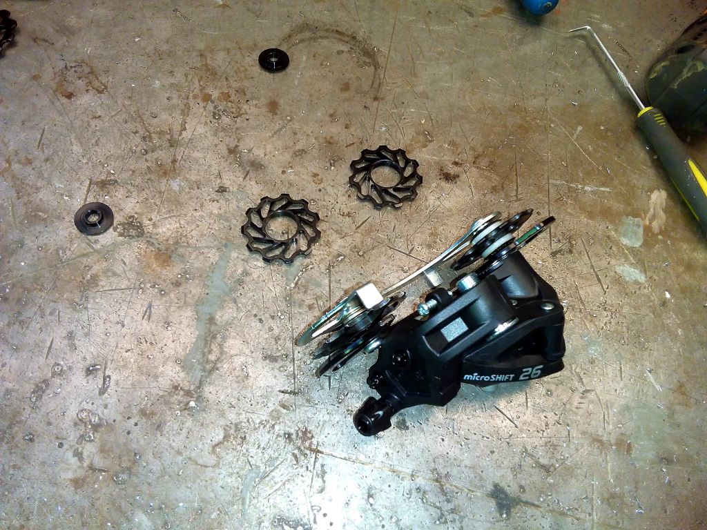 Проточил найденный в закромах втулочный и запрессовал туда два подшипника. Теперь, правда, дерейлер придется через проставку прикручивать т.к. ролики ушли на 4мм в сторону колеса.