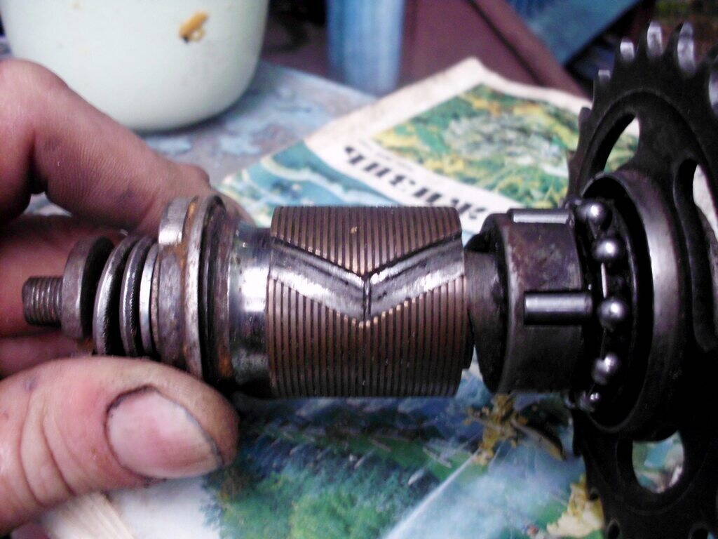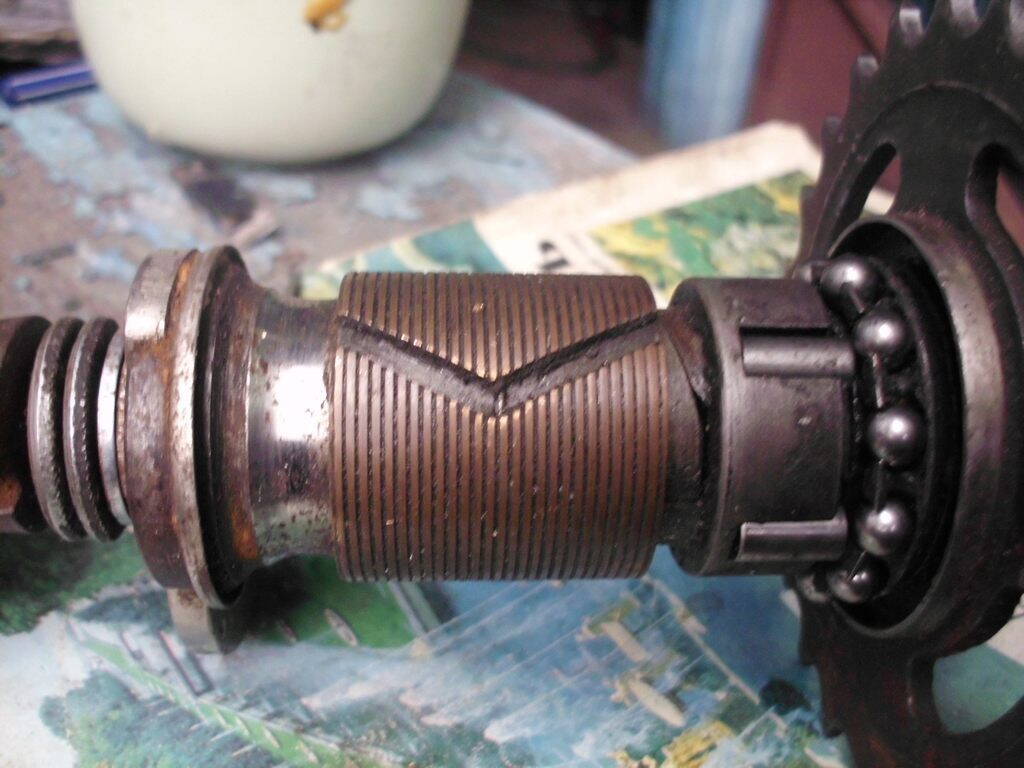 Да, мотовелосипед — настолько хреновый велосипед, что я пришёл к полному отрицанию вело-составляющей в его конструкции. Полному, а не только педалей, прошу заметить! К моменту просветления я уже достаточно хорошо ориентировался (с помощью старшего на пару лет, очень грамотного друга — спасибо ему) в настройке зажигания и карбюратора, подбору свечи и т.д. Моторчик мой заводился с пол-оборота. Поэтому педали и вся фигня до вала каретки включительно были выкинуты. Оставлены чашки (ещё на ХВЗшных рамах), туда вставлен железный пруток 16 мм длиной сантиметров 35-40, на концы натянут резиновый шланг, который и удерживал пруток в чашках. Насколько ж приятнее стало кататься без педалей!