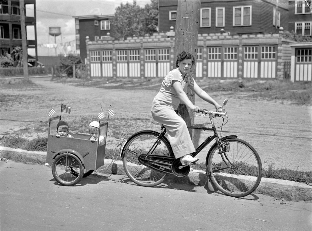 Аннотация к фото: "26 июня 1942 года, Норт-Кембридж, США. Велосипедный прицеп позволяет миccис Оскар(?!) Рубийяр брать своих детей, Филлиппа и Рене, с собой, отправляясь за покупками или на прогулку. Детям это нравится "
