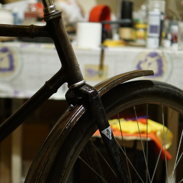 По прошествии месяца нигде не облезло, несмотря на всего один слой. Решил-таки набраться смелости и задуть весь велосипед, так как от дождей голый металл рамы начал сильно рыжеть. Спонтанно нарисовал на ногах вилки треугольнички с надписью В-110 ЗИС, чтоб не так скучно смотрелось. Лень разбирать рулевую и снимат ьвилку, чтобы  установить наконец-то появившийся у меня ЗИС-овский шильдик- но надо бы, надо...