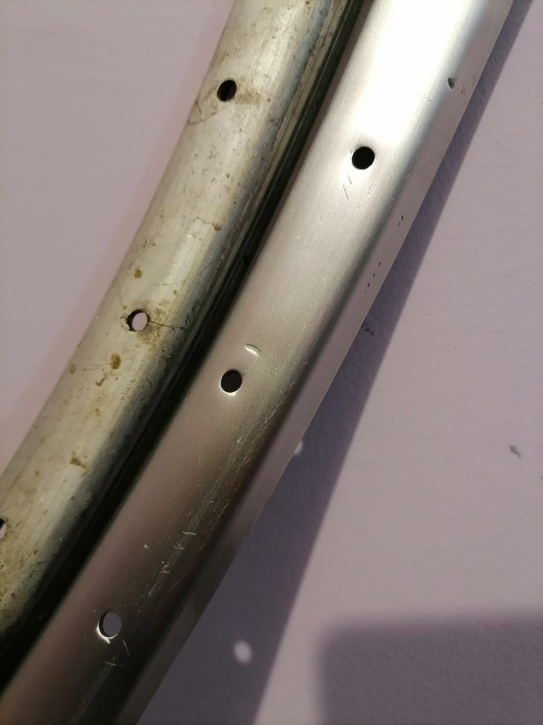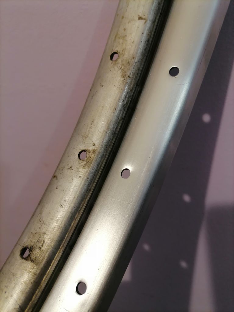 Обод обработал наждачной бумагой 320, а затем затер красно-коричневым скотч-брайтом. Он как бы тоже примерно 320 абразив, но рисунок рисок дает совершенно другой. Выходит как то вот так: