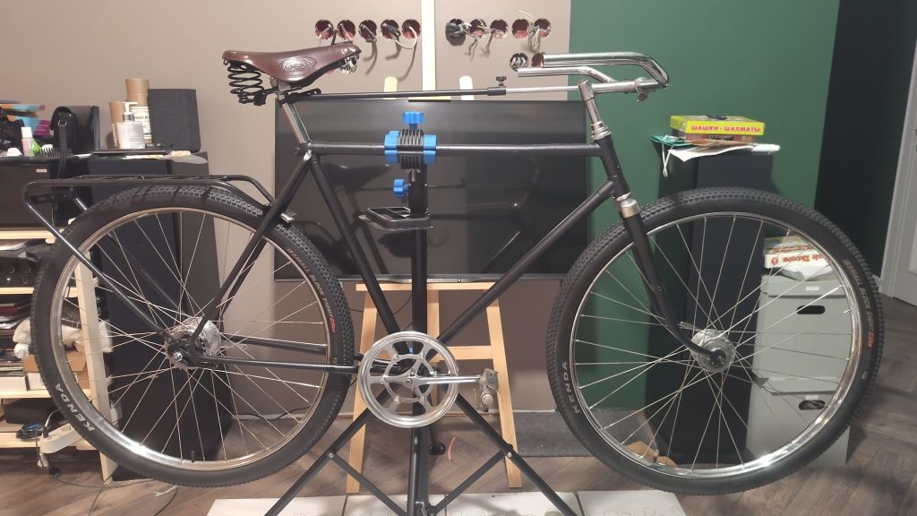 Зимнее седло из кожи молодого дерматина и крылья с брызговиками есть. Ещё есть багажник и другой руль для вертикальной посадки. Вертел я креветкой на морозе ехать — не удобно. За 10 лет зимнего катания так и не привык.