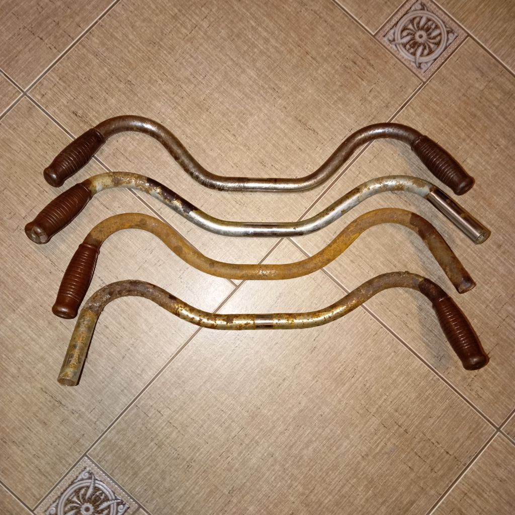 Мои попытки найти руль к В-138: все 4 руля на фото отличаются, из них только нижний откручен от реального В-126, остальные непонятно от чего. У верхнего короткие грипсы 9,3см, у остальных длинные 9,5см. Есть подозрение, что верхний от подросткового Орлёнка с грипсами под детские руки