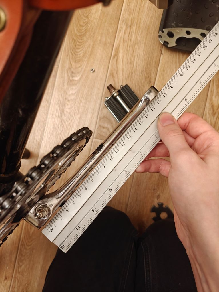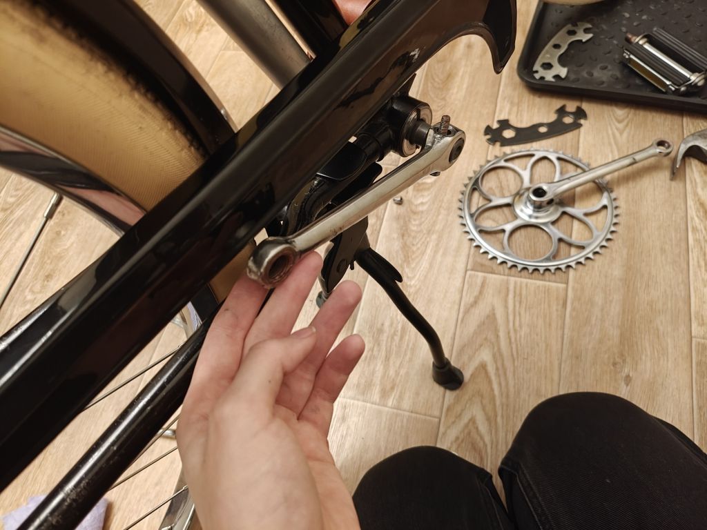 Отнесла это дело на работу, спустилась в мастерские, но дальше примерки к тискам дело пока не сдвинулось — валявшиеся в свободном доступе трубы не подошли по диаметру. ∅40 слишком большая и упирается в звезду при попытке действовать рычагом, ∅30 маленькая и не налезает на шатун. Придется донимать сантехников.
