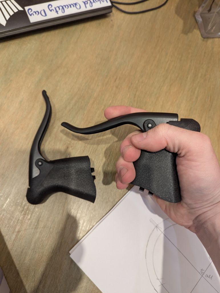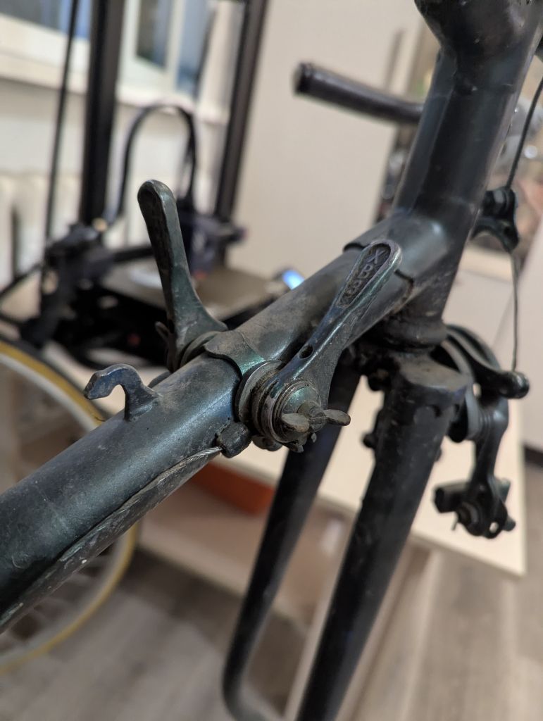 Вот такие вот ручки тормозные за смешные 130 рублей новыми. Краску с рычагов снял. Корпус цельнопластиковый, но вроде норм, а главное удобные. Не вижу смысла уродоваться с родными и терять самый удобный хват. К тому же, родные были в таком состоянии, что, честно скажу, выкинул. (единственное, что выкинул вообще-то). Руль оказался заранее разогнутым, что и хорошо. Вынос оставил длинный, который стоял на нём, подходящего у меня не было. Может и норм будет по посадке, а если нет то найду и поменяю.