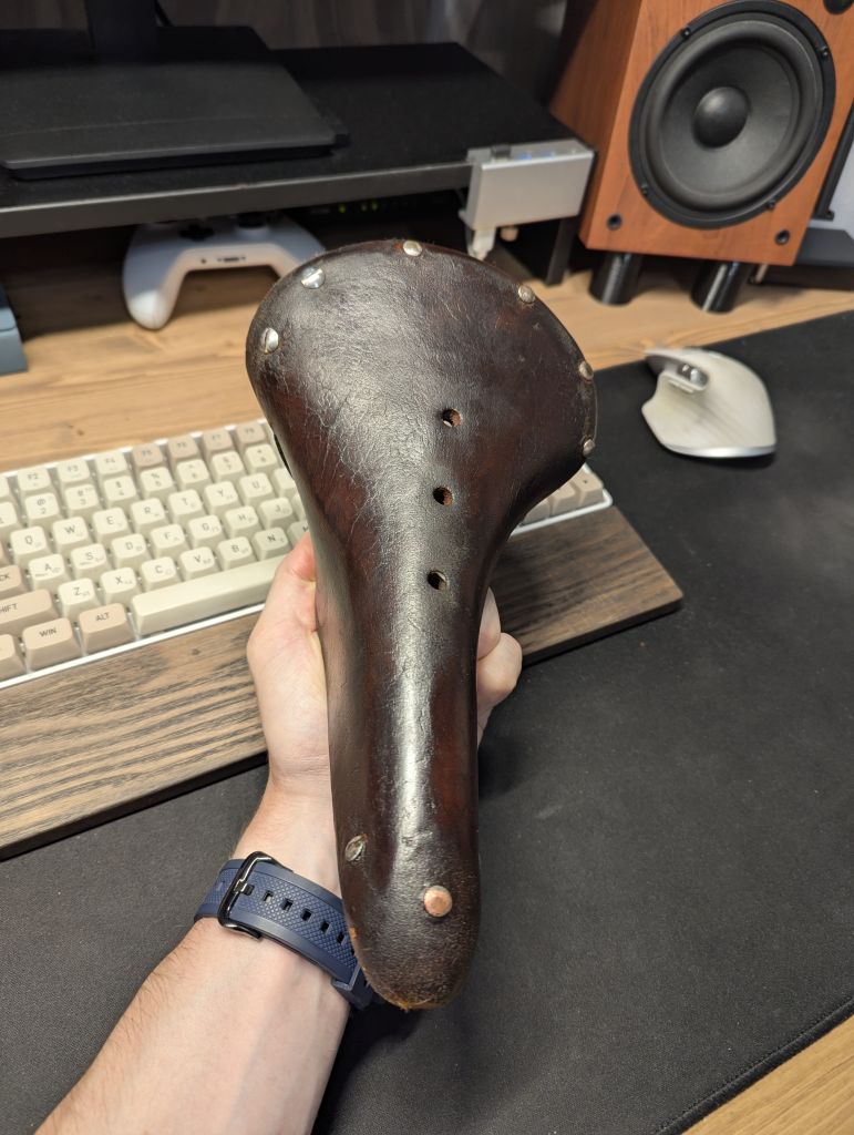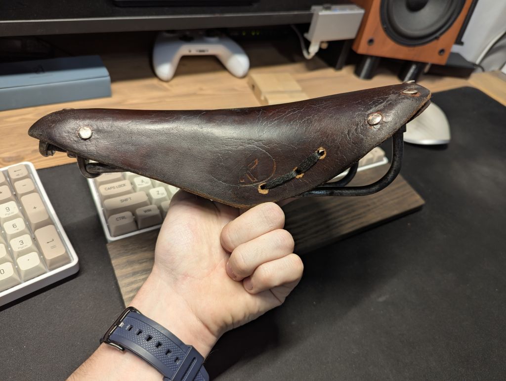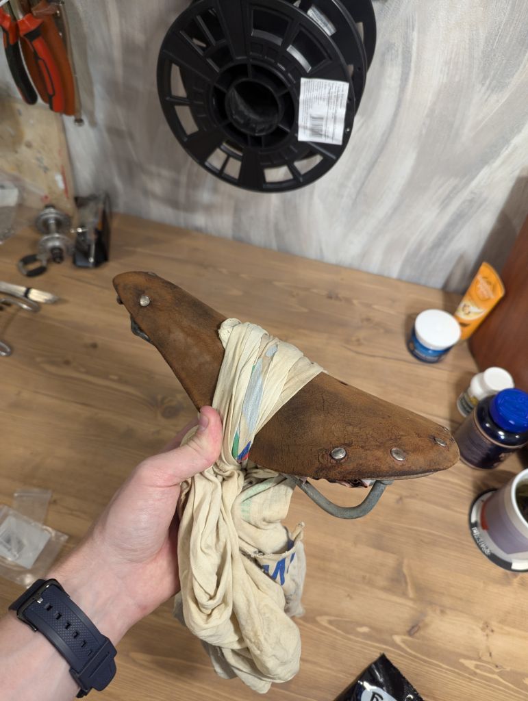 Седло по классике: шкурение, желатин, пропитывающая краска, финиш для кожи, восковой крем, ну и уши стянул сразу. Скоба натяжителя у меня нашлась, вместо спец болта вставил обычный, держит, проверял раньше.