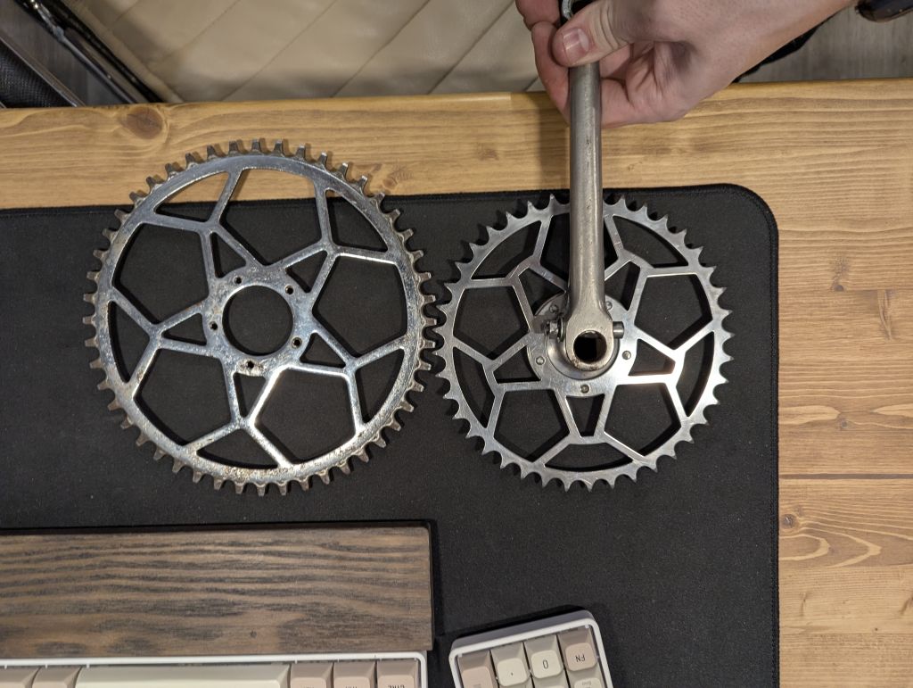 VS_M, рассматривал, есть некоторые трудности: при передней на 48 потребуется задняя на 26 для желаемого соотношения, для шиман таких звезд не нашёл, а если и есть, то потребуется сращивать цепь из двух, что непрактично. И резать самостоятельно тоже сомнительно, т.к. потребуется термообработка, чтобы ходило нормально