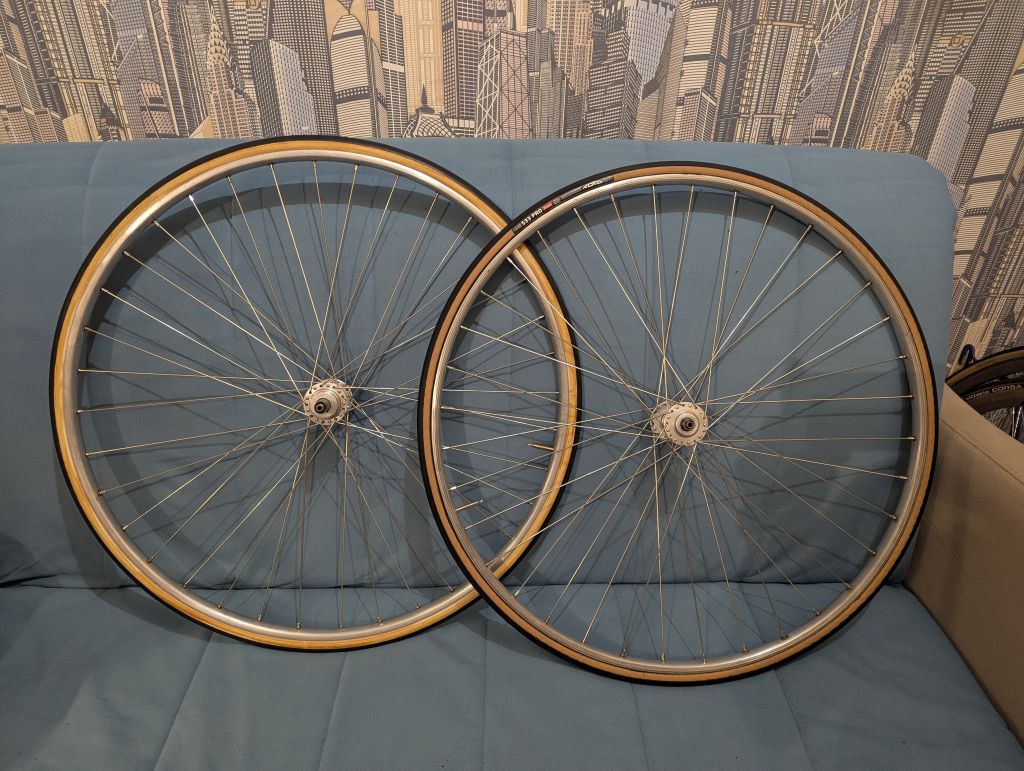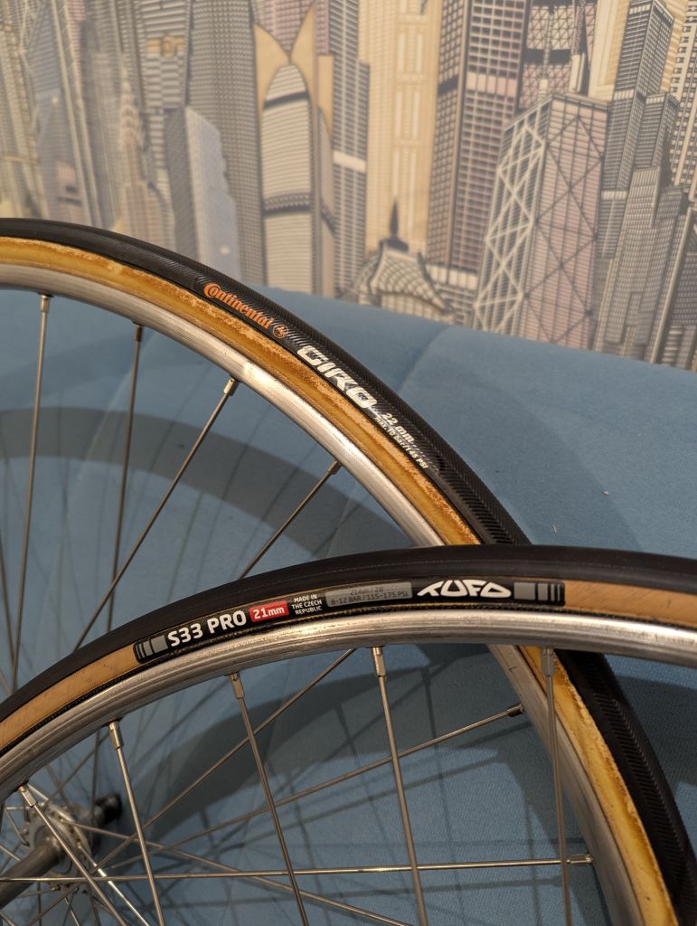 Ну и ещё похвастаюсь, сделал "ездовые" колеса на В-551. Скомплектовал из остатков, что было. Втулки поздние СШ, спицы нержавейка, ниппеля латунь, обода СШ, трубки на скотче для трубок. Трубка континенталь давно лежала за бесплатно, а туфо пришлось купить. Оказалось, между 21 и 22 мм очень заметная разница.