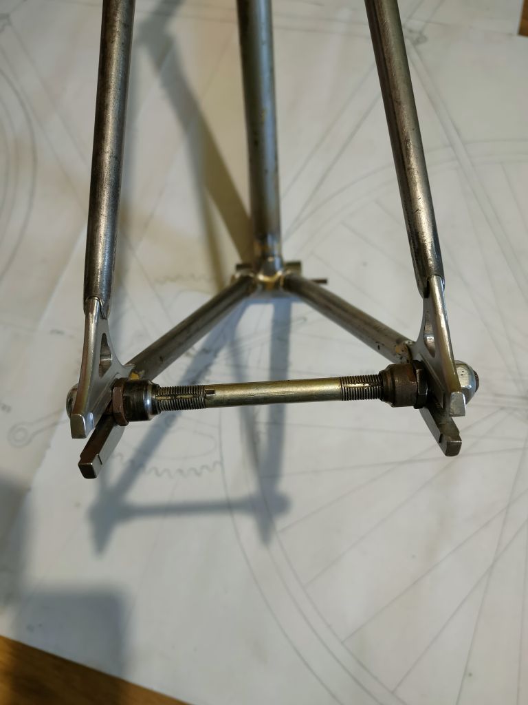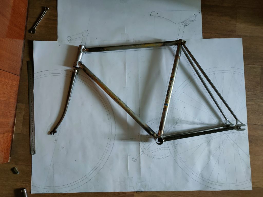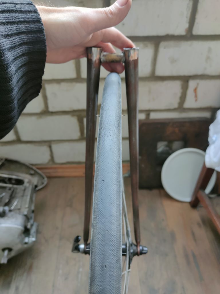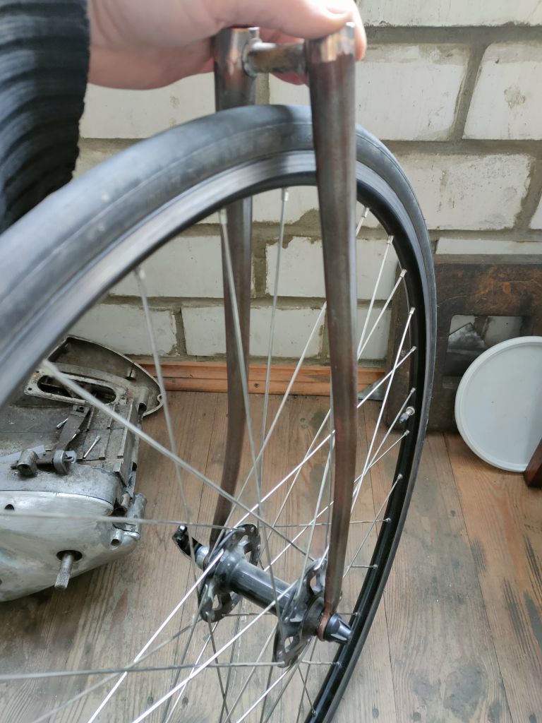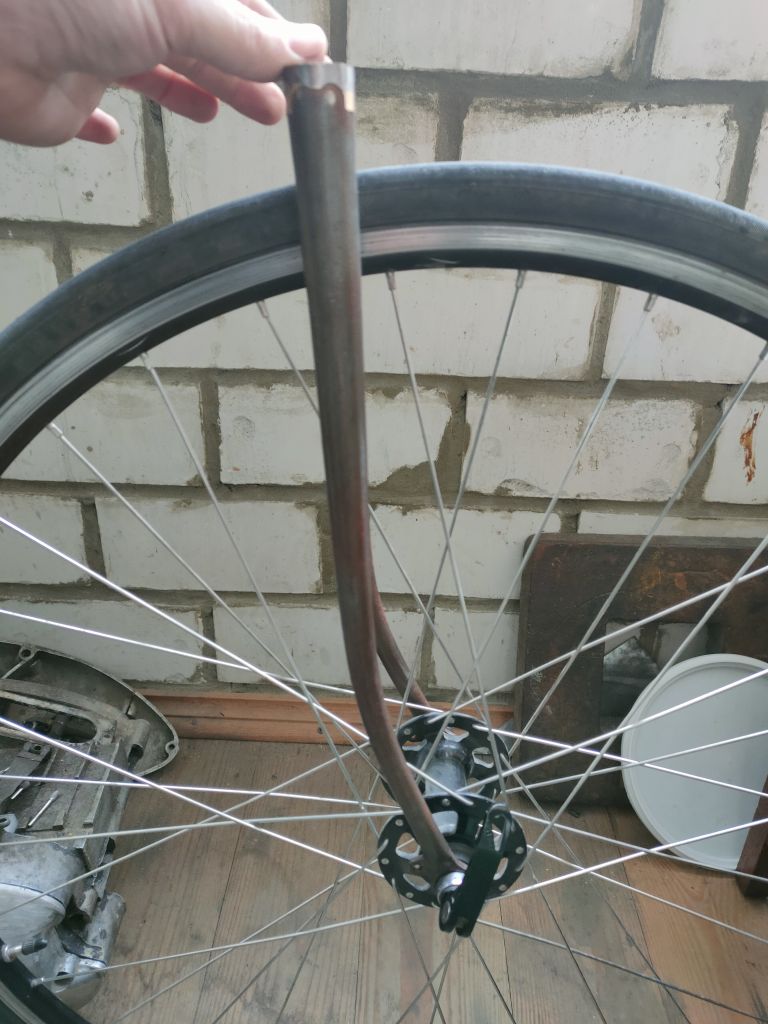 Ну и вилка конечно же)). Это эксперимент. После работ с нижними перьями я понял, что возможно мне не удасться распрямить раннюю вилку стартона, начал рассмариваь варианты поздних вилок. Заметил что вилки 80х и 90-х годов отличаются толщиниой трубы. У 90х они сильно жирно смотрятся, для меня, делающего акцент на 50х-60х годах, лучше подходит вилка 80х годов. Купил вилку, покрутил повертел. Корона труп, шток можно использовать и ноги тоже. Подумал что хочу круглые перья и попробовал стартоновские ноги деформировать в круглое сечение. Да, идет довольно легко, хотя всеравно нужно чувсвовать металл. В общем до полного круглого сечения не довел, остановился на 25х21,5мм. Посмотрел покрутил, думаю на этом остановлюсь, профиль мне нравится. Можно двигаться дальше.