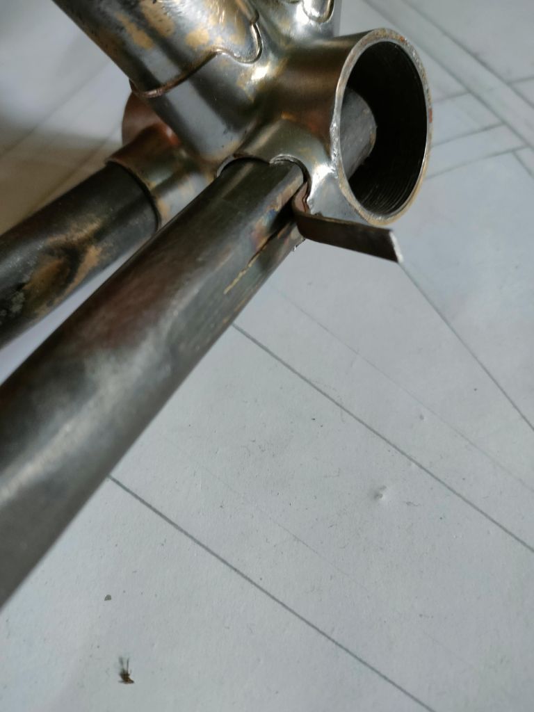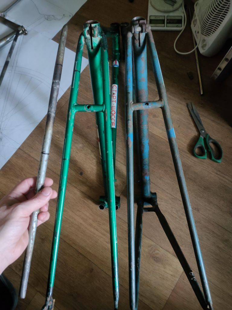 Сами трубы. Нижние перья взял от донорского 555. От 552 мне не нравится их профиль, он не имеет четкой линии, какие то пузатые, как буд то от туриста, а не от стартона. Специально выстматривал фото 552, они везде такие, видимо был период поставок именно таких труб. К тому же меня сильно не устраивает ота огромная выемка под звезды. Она ни туда ни сюдя не попадает. А конкретно на моем 555 она была не такая глубокая (отличительная особенность 72г и 73г., хотя выборка маленькая, но тем не менее). В общем саму вмятину я попытался выпрямить, грел место и точечно выдавливал изнутри. Да получается, но металл конкретно на этих трубках все же не простой, в центре получилась трещина. Довел место до ровной площадки, планирую сделать накладку, довести до круглого сечения и всё вместе впаять в каретку.