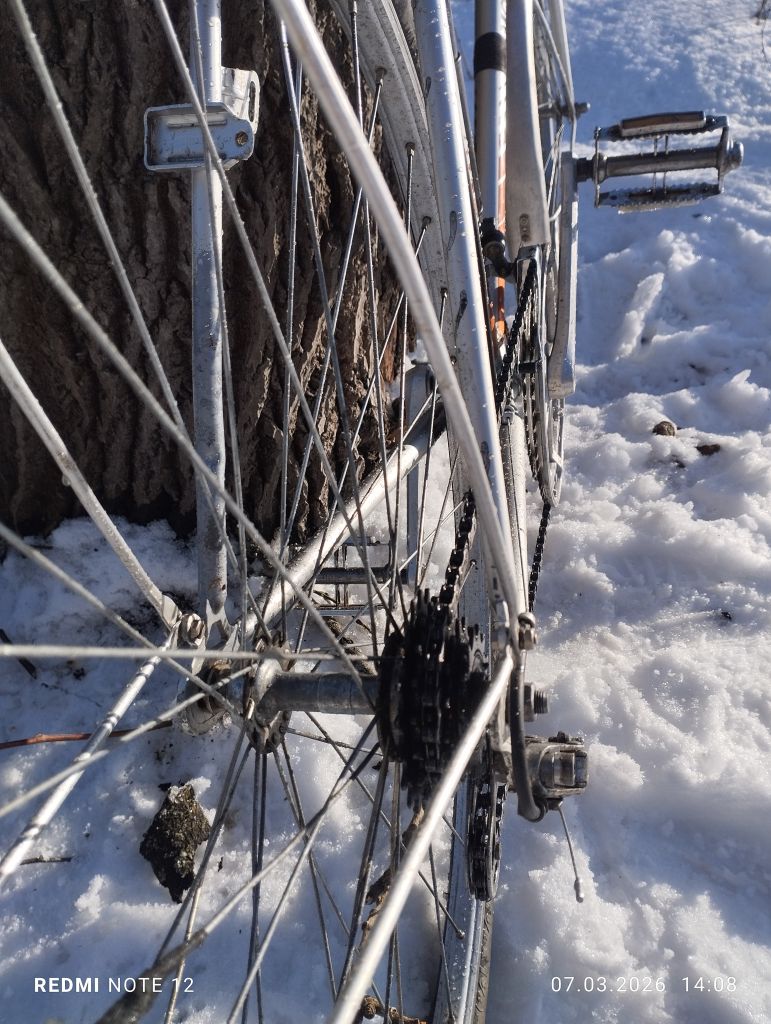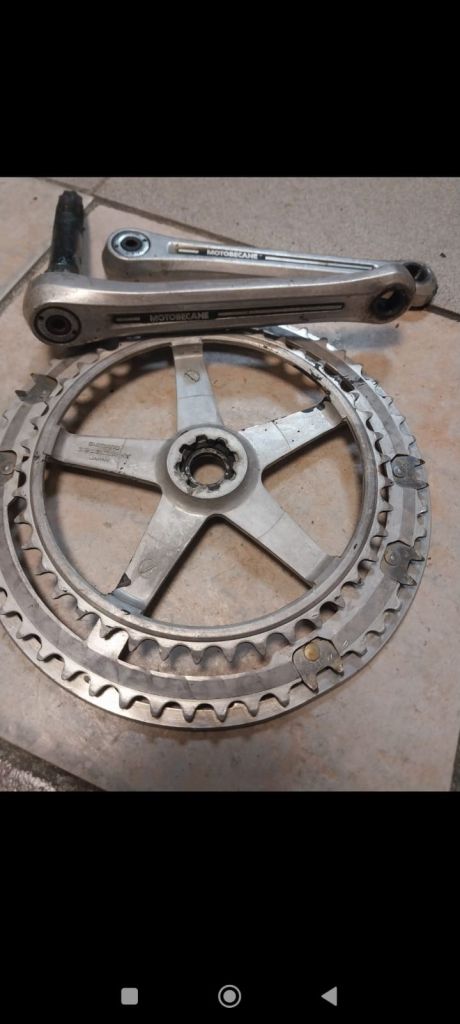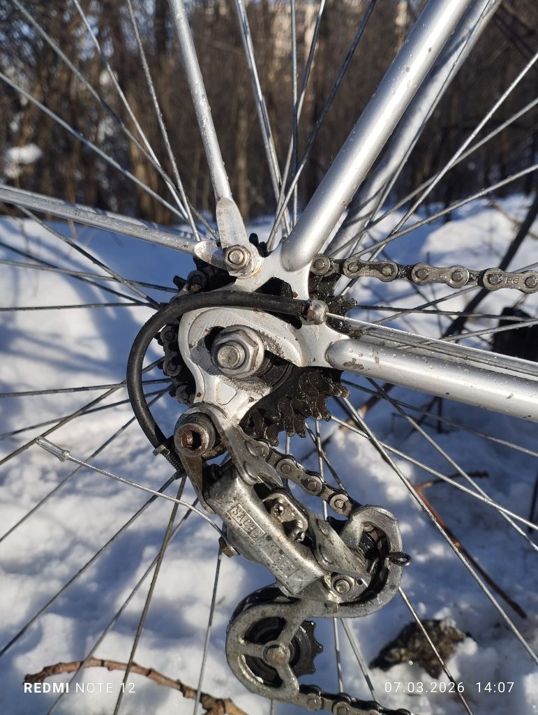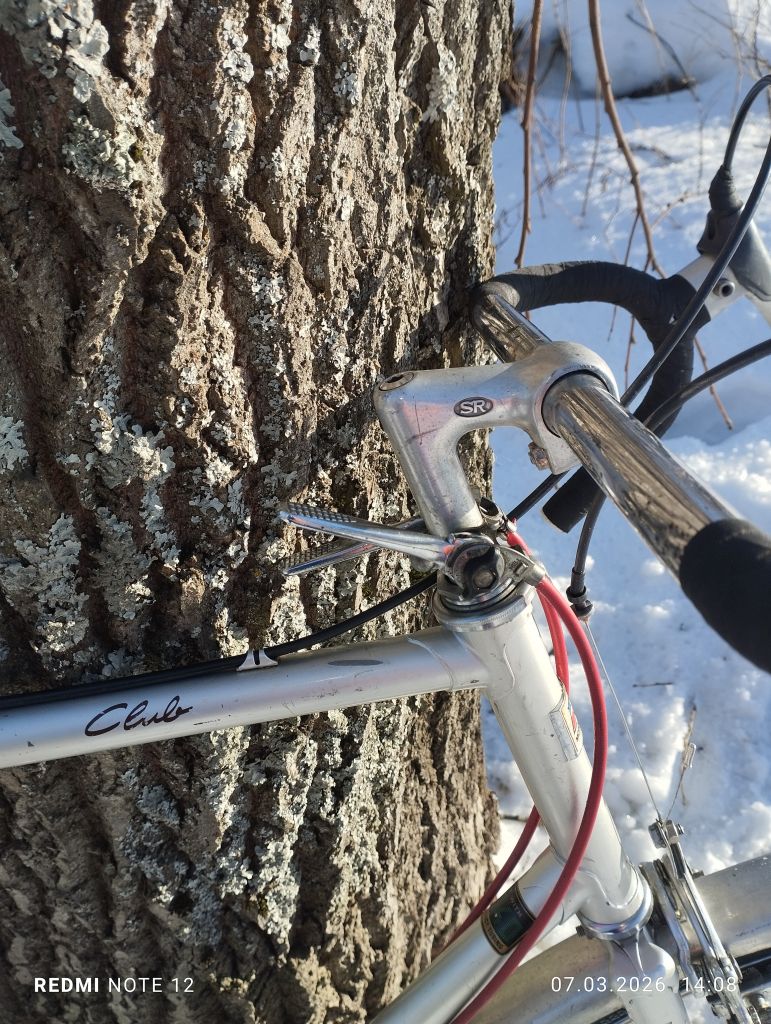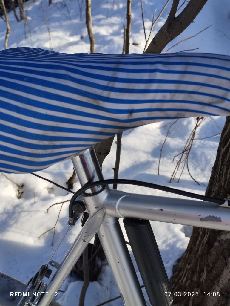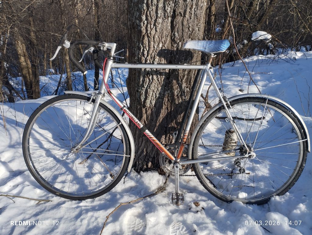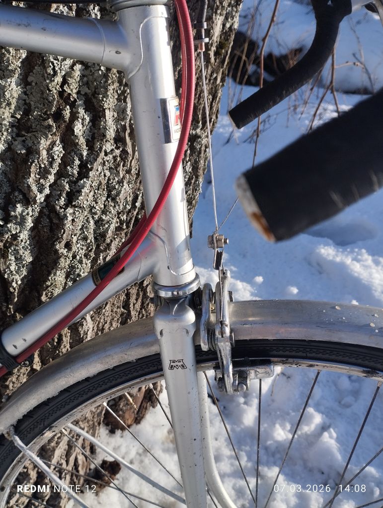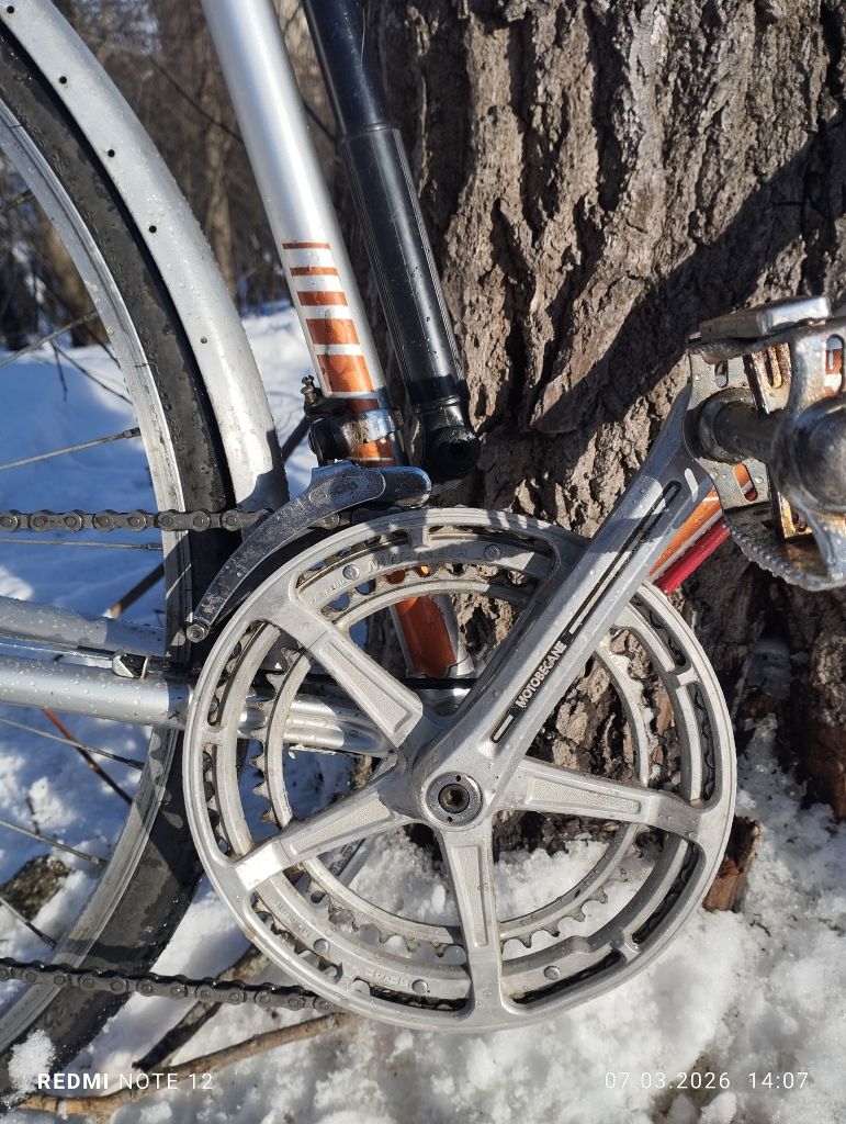 Как почти  всегда будущий " ходовой экспонат", попал ко мне после дтп, и в раз укомплектованном состоянии,. Конкретно этот мотобекан был с раздолбанным и скрученным каким то непонятным ударом, левым пером задней вилки, и представлял из себя раму, вилку, подседел с рваным седлом,  и все ...отсутствовала даже каретка, но имелась родная рулевая ...Рама явно туристическая, на двухметрового дяденьку... Как ни странно но я на ней вполне себе неплохо еду, ну ноги бы чуть чуть длиннее...Перекупщик что продал мне ее, истории ее не знал, куда делись комплектующие, тоже не сообщил.  Позднее он продал мне систему, но сказал что не знает от этого велика она или нет)). Пришлось как всегда скребсти по сусекам...Кое что наскреб...почти все французкое, кроме некоторых мелочей от хвз и " женского" заднего алюминиевого крыла с профилем один в один как у хвз спутник. ...Некоторый интерес представляет система шатунов и каретка велосипеда, это дьявольская смесь современной шлицевой, и каретки Томсона ....Собрание старых велосипедов из Петрозаводска. [.      Собрание старых велосипедов из Петрозаводска. Собрание старых велосипедов из Петрозаводска.   Перекупщик продал мне систему без обеих чашек, куда они делись он не сообщил...Это создало некоторые трудности, но хвала озону, мне удалось найти чашки ( вместе с другим совсем валом), они подошли по резьбе но не подошли по диаметру шариков . Методом проб и ошибок я установил что в этой системе в правой и левой чашке, шарики разных диаметров...Озоновскик чашки также пришлось подрезать по длине . Все это я рассказываю что бы уважаемые читатели понимали, с какими трудностями можно столкнуться при восстановлении старых, не советских велосипедов .. Остальное в принципе прошло относительно нормально, с небольшими проблемами и трудностями.  Велосипед имеет базу при 63.5 росте 1070 мм . ( Максимально возможная 1080мм), и очень легок и приятен на ходу. Нижний мостик штампованная пластина на контактной сварке, дропы штамповка,  верхний мостик трубка загнутая из листа ...Вилка имеет вставку трубки внутрь, как на поздних советских туристах ... В общем довольно бюджетно все . .Тем не менее крепко и удобно. Вес в сборе 13.8 кг, учитывая алюминиевые крылья, но тяжёлый стальной руль, обод переднего колеса из стали, обе стальные втулки , полностью стальные переключатели и манетки...Тем не менее вес особо не чувствуется на ходу ..Велосипед оснащен набором разных приваренных креплений для багажника, замка и прочего.