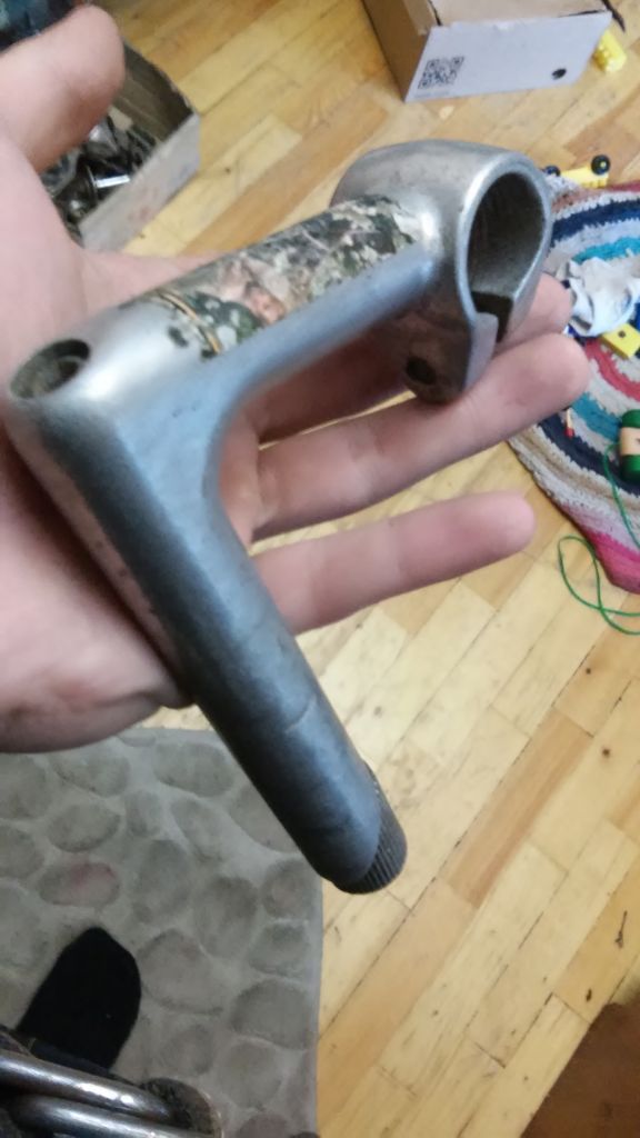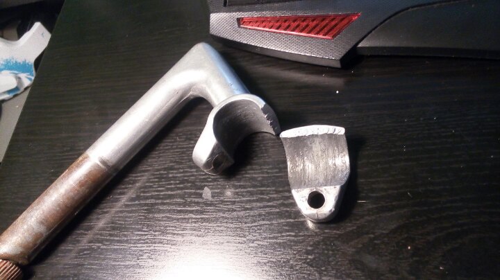 Также возможен сценарий, когда вынос недотянули, и руль иногда смещается. Его сильно поправляли руками, а затянуть ленились. Из-за износа поверхностей трубы и дырки в выносе, появился зазор, руль начал вообще болтаться. Тогда его всё-таки затягивают. Из-за зазора, делать это приходится от души. Получается та же история — деформация под напряжением, здравствуй, трещина.
