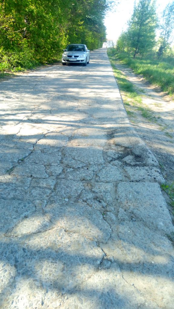 Поворот направо перед Обуховом я проскочил (телефон лежал в сумочке, я в него заглядывал периодически), пришлось вернуться. Стало понятно, почему проскочил — мне бы с страшном сне не приснилось, что ЗДЕСЬ будет проходить велогонка. Тут из моих уст снова вырвался нецензурный возглас, но уже без восхищения, ибо восхищаться там нечем — два с половиной километра убитой бетонки с крупными камнями в бетоне, трещинами и ямами. Не знаю, как там на двухподвесе, может и нормально, но на шоссере трясёт немилосердно. Пробовал ехать по грунтовой обочине — увы, не на этих шинах.
