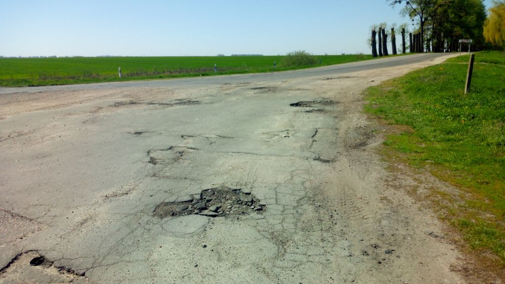 И тут ветер, который дул в лицо всю первую половину дороги, озверел вконец. Встречно-боковой, он и мешал ехать вперед, и буквально сталкивал меня с дороги. В мечтах о повороте, после которого ветер будет дуть в спину, я как раз его и пропустил, пришлось возвращаться. Участок Шевченкове-Копачів — на слабую троечку, вначале дорога латаная-перелатаная, как лоскутное одеяло, и, соответственно, горбатая, дальше просто много ям — местами ехал тупо по осевой, благо, машин почти не было. Вот, кстати, интересно — проезжаем реку Стугна, как думаете, село за ней как должно называться? Правильно, Застугна. Когда проехал его, рассчитывал на въезде с другой стороны увидеть табличку "Передстугна", логично же, но нет