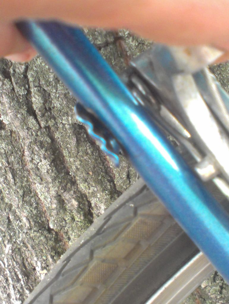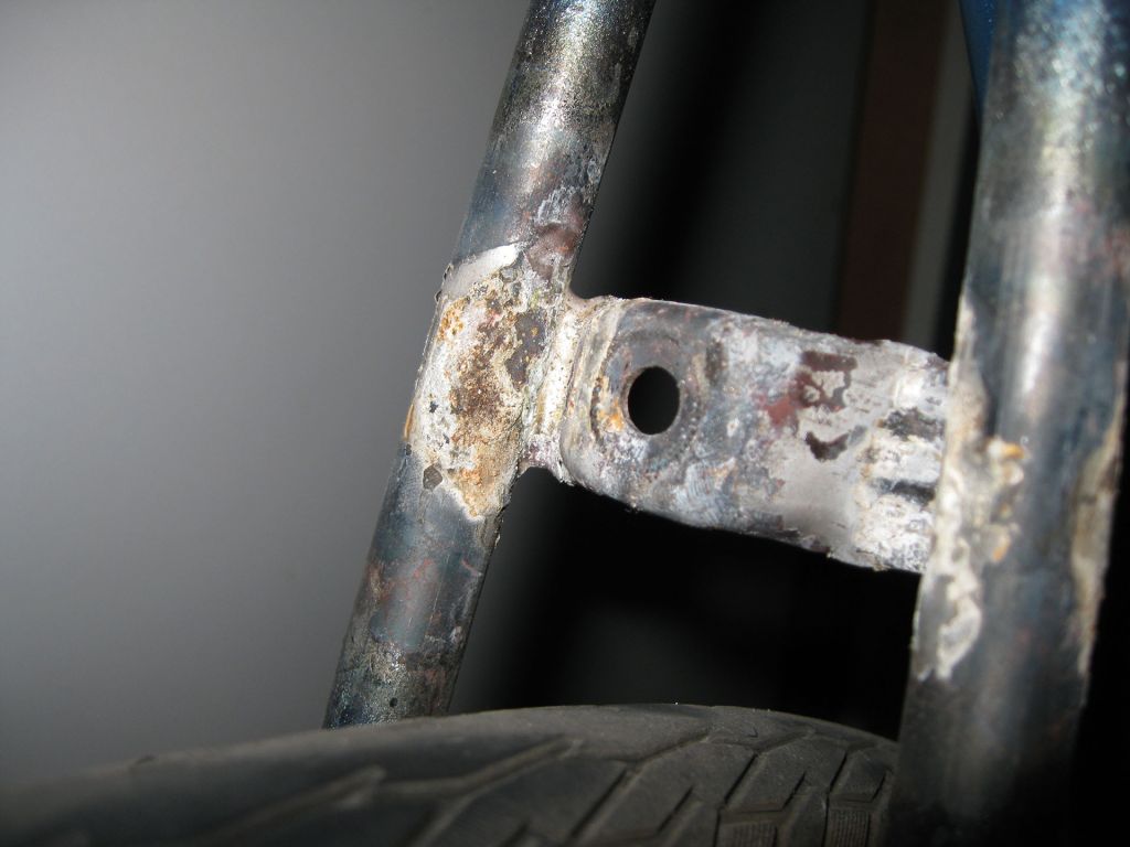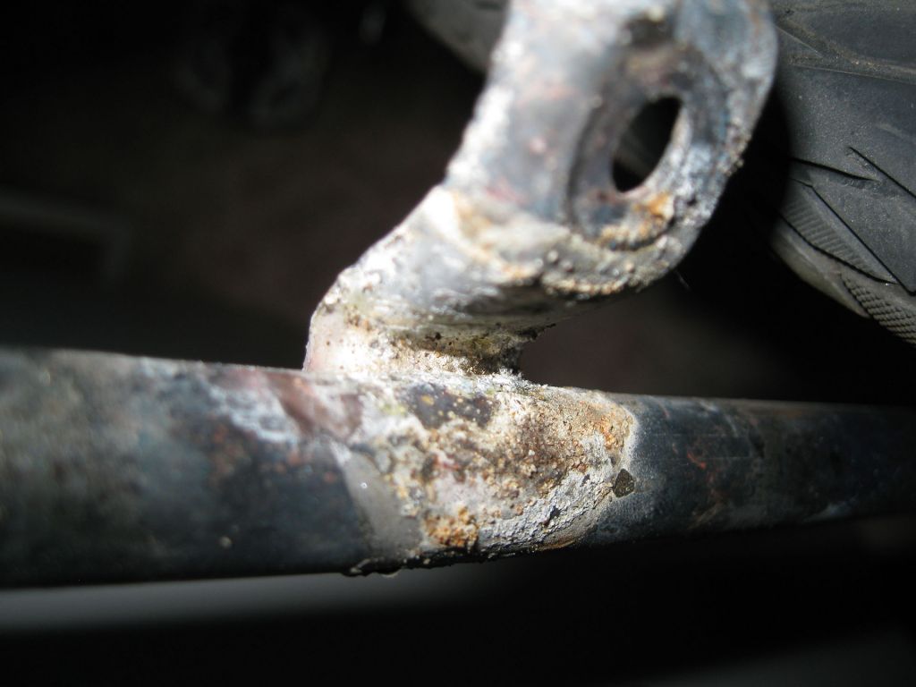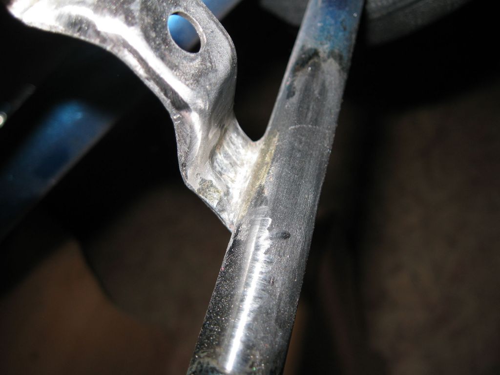 Первый опыт пайки можно признать успешным. Относительно. Собственно к пайке вопросов нет, держится отлично и будет держаться пока рама не сгниет. Но изначально мостик был приварен не по центру, и та часть, которая осталась держаться на сварке, не хотела отрываться ни в какую без деформации и перфорации пера. Оставил временно как было, может когда руки дойдут поменять на трубчатый. А пока пропаял и второй конец мостика на всякий случай.